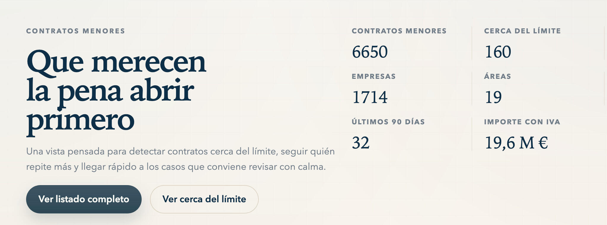 La ley de contratos del sector público establece que un contrato menor no puede superar los 15 mil euros (más IVA) si es para un servicio, ni los 40 mil euros (más IVA) si es para una obra. La web permite identificar fácilmente aquellos expedientes que se quedan rozando exactamente esa cifra. Que una adjudicación esté muy cerca de su límite no significa que haya nada irregular, pero son compras que conviene revisar con más calma para evitar que se fraccionen gastos o para detectar proveedores que encadenan decenas de contratos en un mismo año.